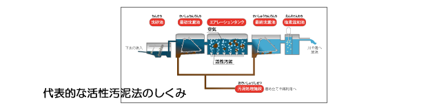 下水・排水に空気を吹き込んで活性汚泥を発生させ、これを利用して、水中の有機物を分解し、浄化する方法。大都市の下水処理に広く用いられています。